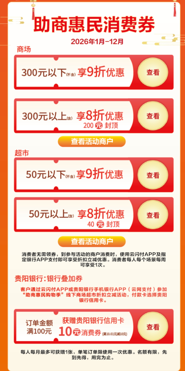 据了解,2026年,贵州深入实施提振消费专项行动,省级层面安排一定促消费资金,叠加行业协会、商家、金融机构促销政策,联动开展汽车购新、网上新春年货节、票根联动促销等活动,以及发放商超惠民消费券、餐饮消费券、老字号消费券。其中,商超惠民消费券重点在2026年一季度开展,将促消费与惠民生相结合,针对城乡居民吃穿用等生活必需品,在全省范围内的合作商场、超市同步开展。消费者在参与活动的商场、超市购物,可享受不同折扣的立减补贴。