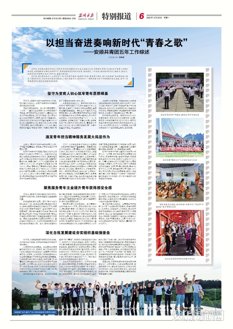 五年来,团结带领全市广大团员青年,在“引领青年思想、激励青年担当、聚焦青年需求、深化自我革新”这四条赛道上跑出了青春加速度,为地方经济社会发展注入了强大青春动力,接续绘就了一幅幅青春与时代同频共振的壮丽画卷,谱写了安顺共青团事业高质量发展的崭新篇章。