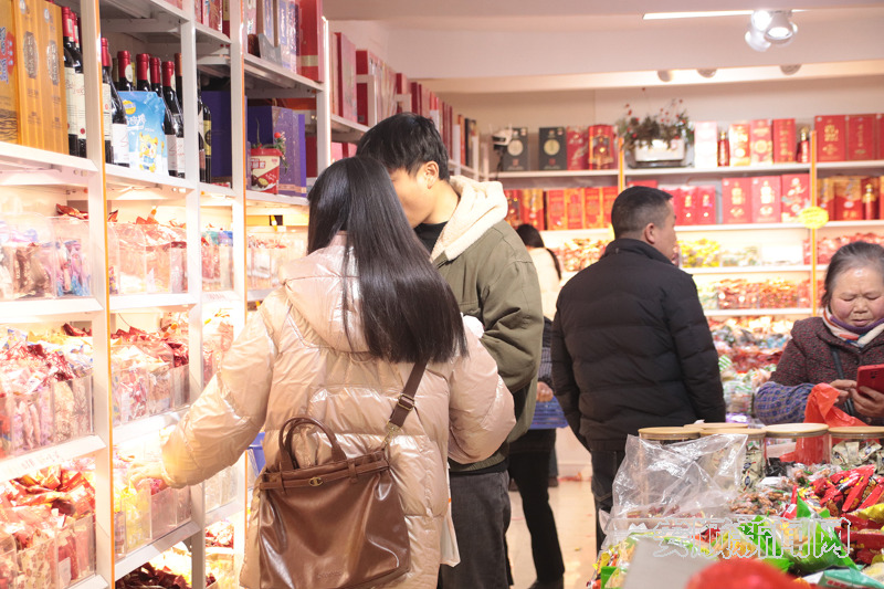 若说春联装点门面,那么糖果零食便是装满团圆的家味。西山批发市场内,“大糖盛食”的铺子早已被各式糖果、坚果、饼干塞得满满当当。店主唐文顺与伙计们手脚不停,一边为顾客装袋一边说道:“我们提前一个月就开始备货啦,就为过年这段时间!”门口方桌上散着试吃的小零嘴,路过的顾客接过一块,听见店员一声响亮的“新年大吉”,不由得笑着迈进店门,不一会儿便拎出一大袋糖果零食。