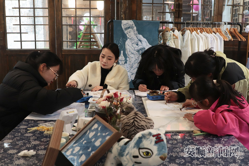 位于安顺古城的八音坐唱茶馆,成为市民与游客体验手作悦己的热门去处。一张张白坯布、一支支蜡刀、一碗碗靛蓝染料,成为人们取悦自己的“载体”。