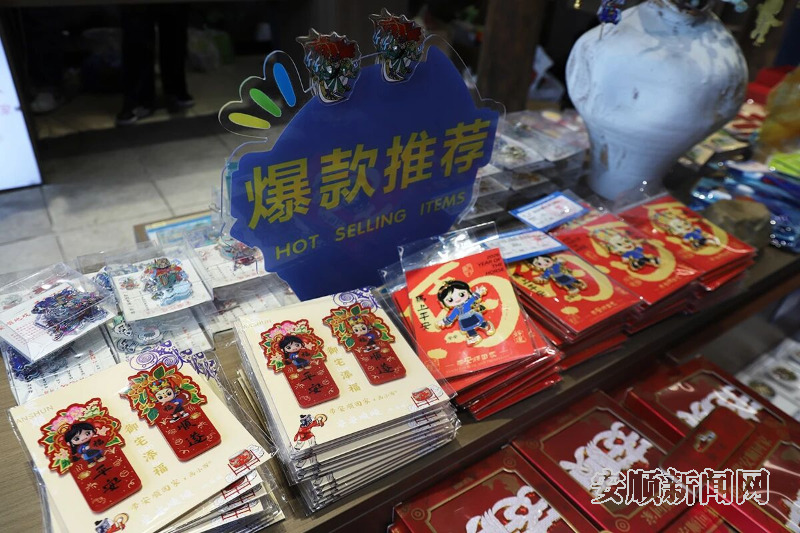 顺着古城的青石板路前行,各式文创小店门前人头攒动,蜡染方巾上的民族纹样、黄果树瀑布造型的冰箱贴、雕刻精美的地戏小脸子、印着“安安顺顺”的保温杯……琳琅满目的文创产品,将喀斯特山水、屯堡非遗、城市祝福融为一体,既有文化韵味,又兼具实用价值。