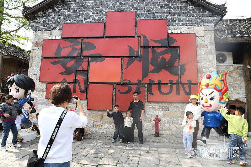 “咔嚓、咔嚓!”在安顺古城历史文化街区的青石板路上,快门声此起彼伏。来自湖南的游客曾理想带着家人正与两个造型独特的巨大玩偶合影,她身后是“安顺”二字的巨幅墙绘。