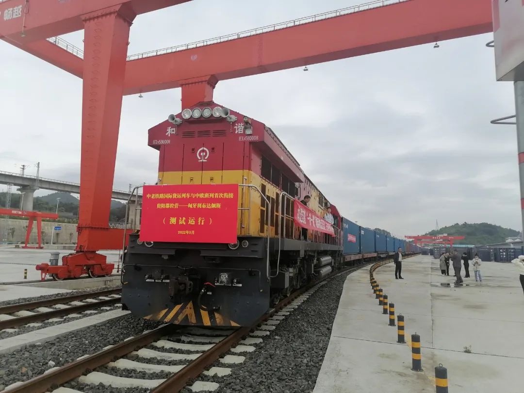 5月18日上午,一列载有50个标准集装箱的中欧班列从贵阳都拉营国际陆海通物流港驶出,预计半个月后到达匈牙利布达佩斯。其中5个货柜橡胶制品从越南胡志明市通过公铁联运经中老铁路抵达贵阳,以贵阳为中转中心,首次测试中老铁路与中欧班列货运衔接运行。