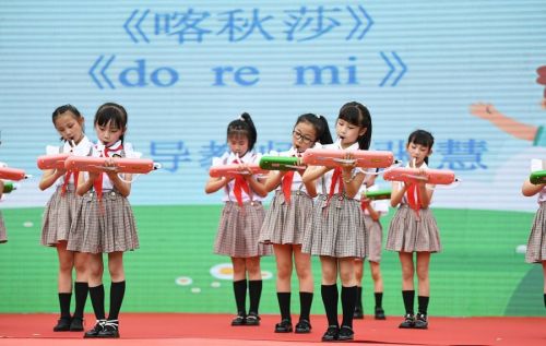 5月25日,贵阳市南明区第二实验小学口风琴社团的学生在学校第二届艺术节展演暨庆“六一”活动现场进行口风琴表演。