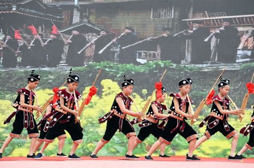 5月25日,贵阳市南明区第二实验小学小尧花鼓社团的学生在学校第二届艺术节展演暨庆“六一”活动现场表演苗族舞蹈《小尧花鼓》。
