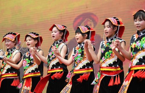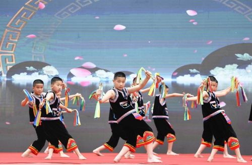 5月25日,贵阳市南明区第二实验小学阿妹戚托社团的学生在学校第二届艺术节展演暨庆“六一”活动现场表演彝族舞蹈。
