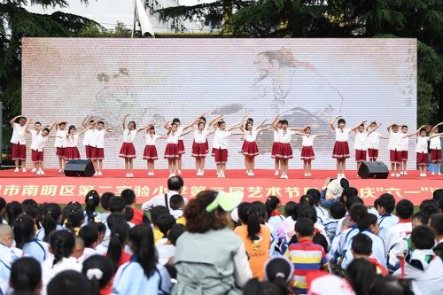 5月25日,贵阳市南明区第二实验小学举办第二届艺术节展演暨庆“六一”活动,小尧花鼓、阿妹戚托、芦笙等20余个社团的学生通过文艺展演的形式,迎接“六一”儿童节的到来。(赵松)