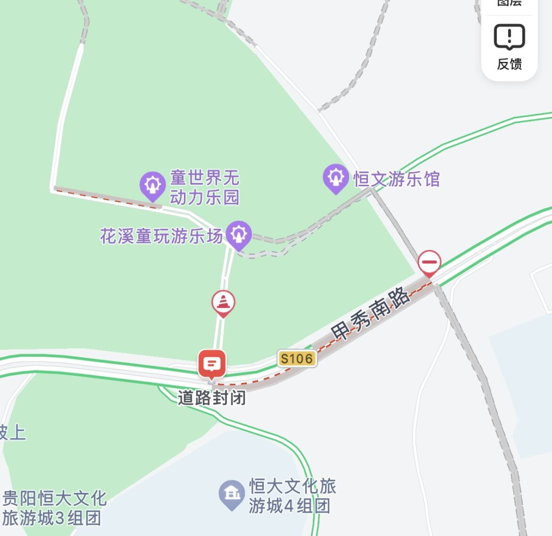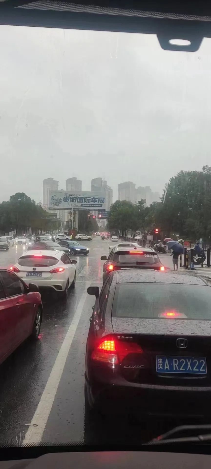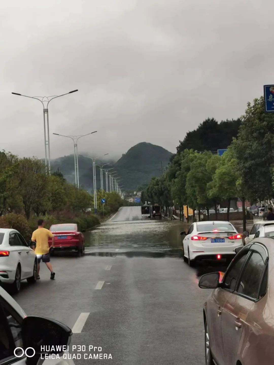 1、甲秀南路花溪一号至恒大童世界路段,因连夜大雨积水导致双向交通中断。