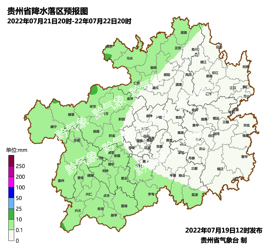 19日夜间到今天白天,全省阴天间多云有阵雨或雷雨,雨量普遍中到大雨,铜仁市东部南部、遵义市东南部、黔东南州北部、黔南州中北部、贵阳市东部南部、毕节市南部、安顺市、六盘水市东部及南部、黔西南州中北部有暴雨,部分乡镇大暴雨。
