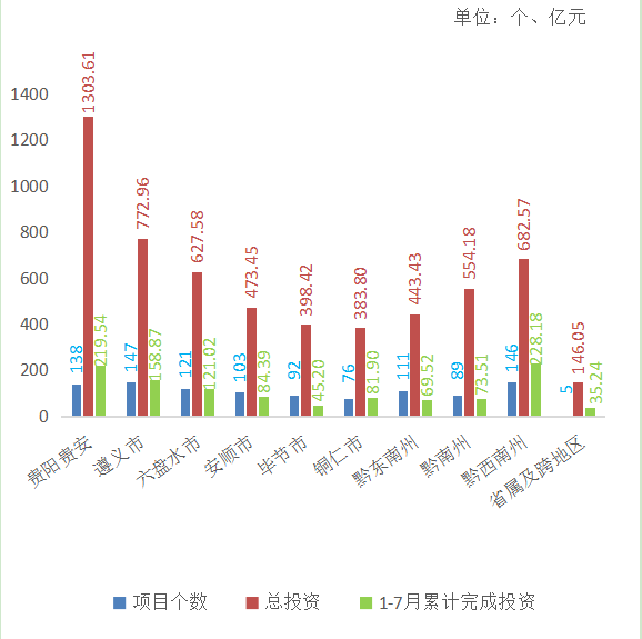 分地区看,1-7月新开工项目个数前三位的是遵义市、黔西南州、贵阳贵安,分别为147个、146个和138个;累计总投资前三位的是贵阳贵安、遵义市和黔西南州,分别为1303.61亿元、772.96亿元和682.57亿元。