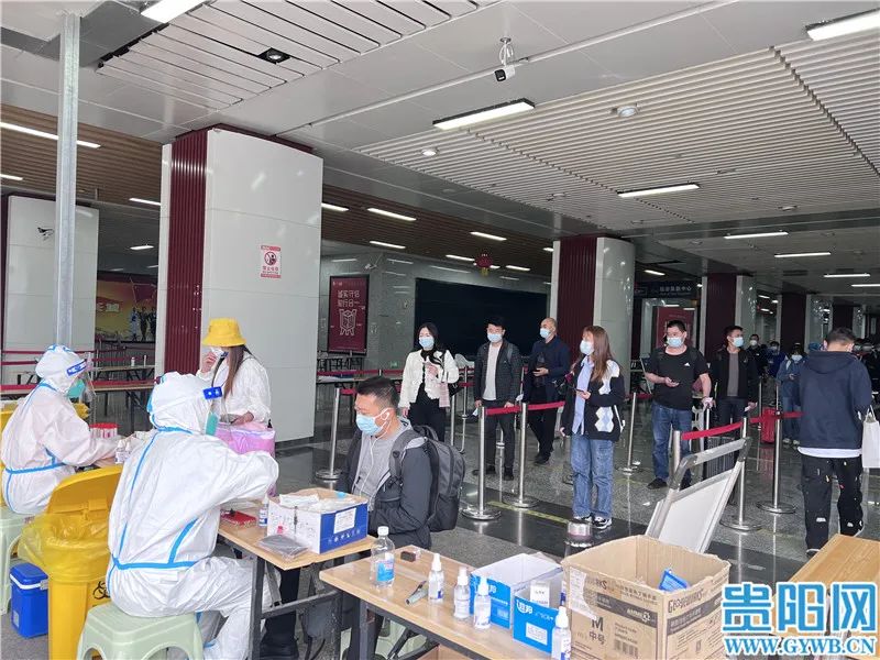 “按照省、市疫情防控的最新通告和提示,我们迅速落实入筑人员健康管理和疫情防控措施,引导旅客安全有序流动,筑牢‘外防输入’防线。”据观山湖区高铁经济带服务中心刘伟介绍,目前,贵阳北站在东、西两个出站口夹层各设一处核酸采样点,共有16个采样台,方便旅客进行核酸采样;同时,工作人员在前期的基础上又增加了20名。旅客从站台下来进入出站通道后,立即实施“入筑即检”,即持有48小时核酸检测证明的,核酸采样后有序出站,防止人员聚集;没有证明的,立即开展抗原检测+核酸采样,抗原检测结果阴性后放行。
