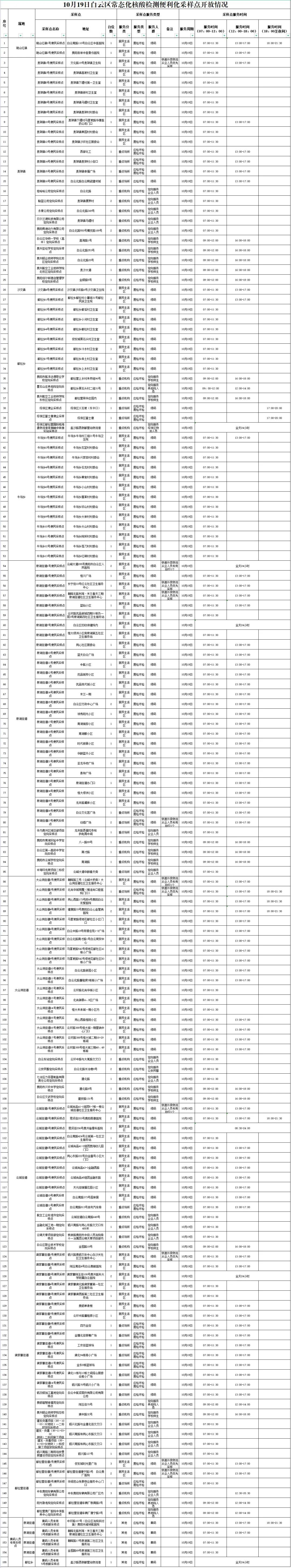 (二)便民核酸采样点服务情况:为切实满足群众就近、便捷、安全、常态化核酸检测需求,我区10月19日在非以上区域的乡镇、街道设置了110个常态化便民核酸采样点、40个定向核酸采样点(具体地址及时间附后),请市民朋友结合实际合理安排采样时间,优先选择12:00前,以便于当日尽快依序获取核酸检测报告。