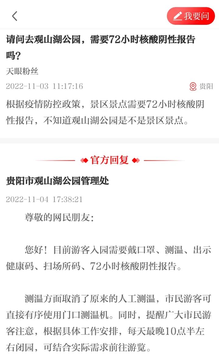 11月3日,天眼问政接到贵阳市民刘先生咨询,根据当前疫情防控政策,景区、景点需要72小时核酸阴性报告,想了解观山湖公园是不是也有同样要求。