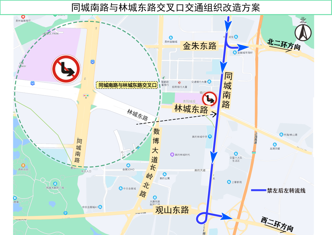 1.林城东路与同城大道交叉口北进口(金朱东路往林城东路方向)禁止车辆左转。需要左转前往西二环或北站的车辆,可以在金朱东路菱形立交或观山东路立交进行换向。