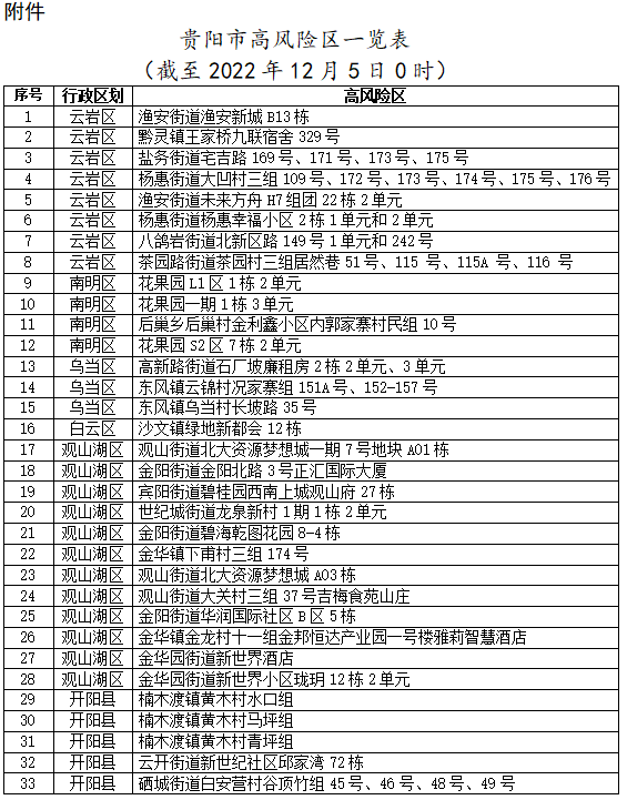 根据当前疫情防控形势,为快速有效阻断疫情传播,实现科学精准防控,切实保障辖区内群众生命安全和身体健康,按照《新型冠状病毒肺炎防控方案(第九版)》《关于进一步优化新冠肺炎疫情防控措施科学精准做好防控工作的通知》(联防联控机制综发〔2022〕101号)相关规定,经综合研判,自2022年12月5日起,将云岩区、南明区、乌当区、观山湖区、开阳县部分区高风险区调整为低风险区,现公告如下: