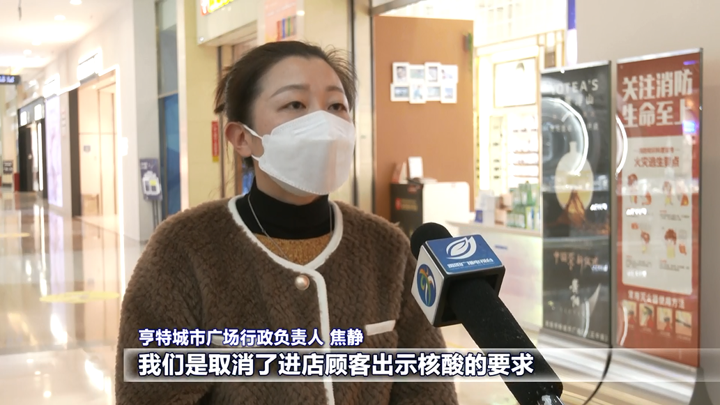 亨特城市广场行政负责人 焦静:我们是取消了进店顾客出示核酸的要求,对于我们品牌方的员工和管理方的员工一周两次核酸是常规开展,以保持我们店内购物环境的安全性。