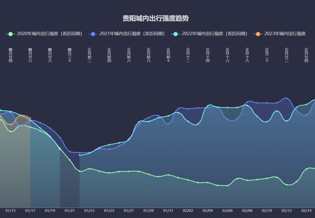 根据互联网大数据统计情况分析,今年春节长假贵阳城内出行强度预计与去年、前年相差不大,全市道路交通基本处于畅通自由流状态。新春佳节,市民出行主要还是以走亲访友、聚餐游玩、商圈购物、扫墓祭祖等为主,届时商圈、景区、公墓等周边道路可能会出现局部的交通缓行。
