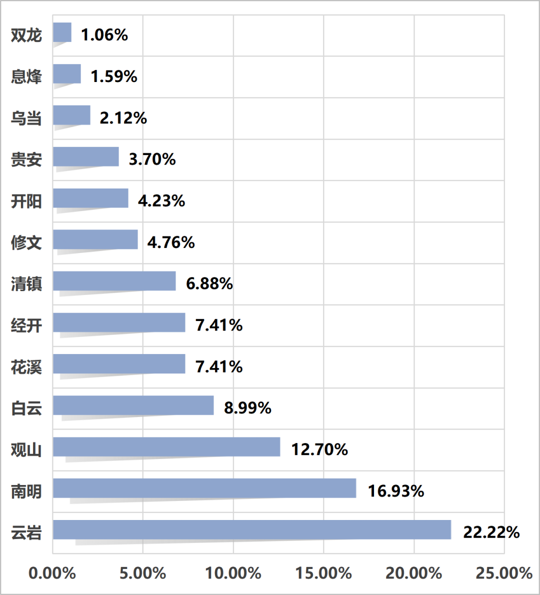 二、观山湖区泉湖辖区、世纪城辖区,云岩区渔安辖区,各占全市立案3.7%