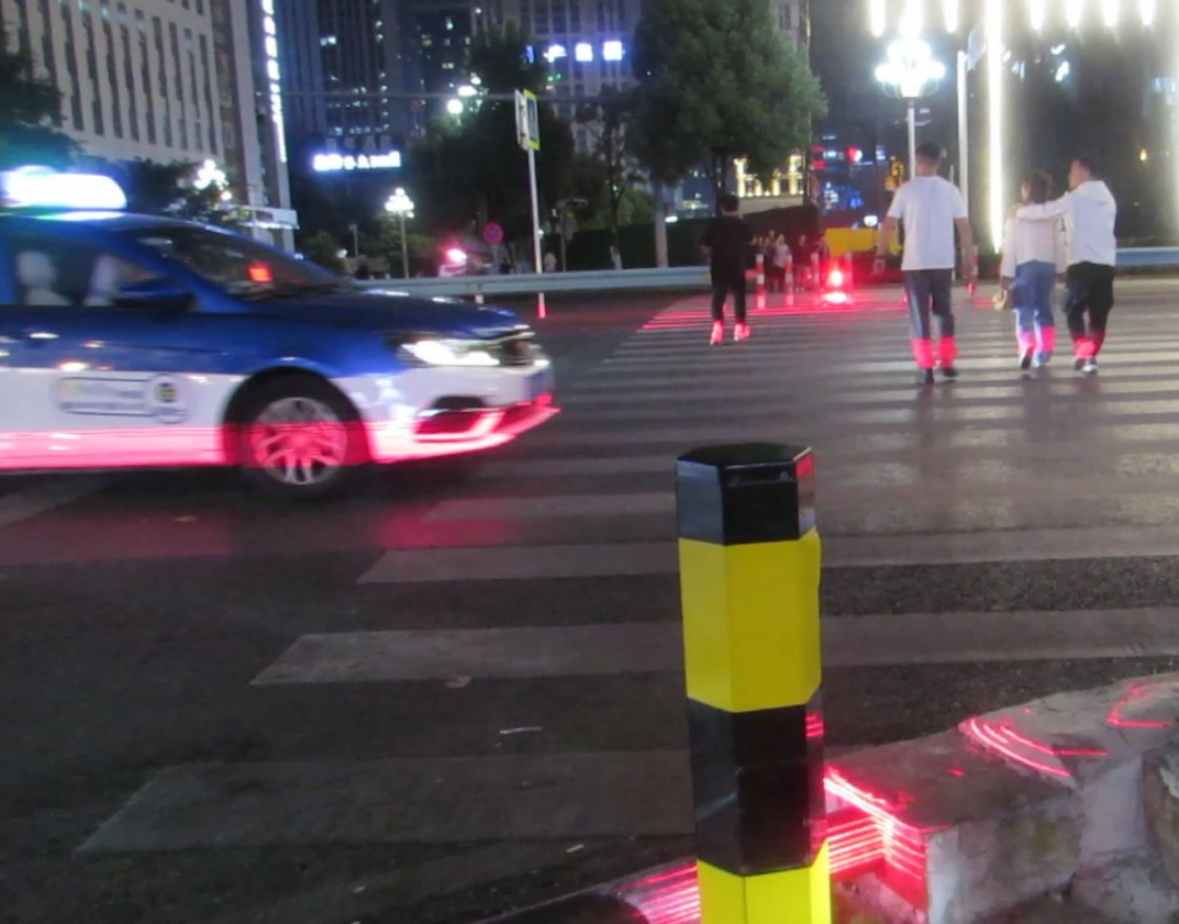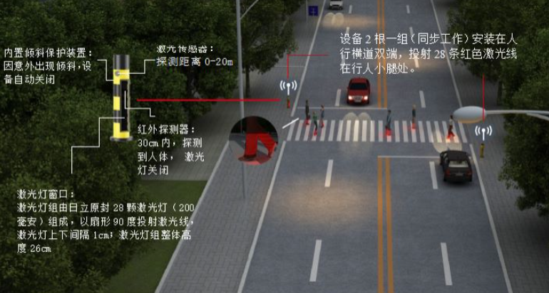 人行横道激光安全警示辅助装置在过街行人即将进入斑马线的瞬间,投射28条红色激光线到过街行人小腿处,形成红色区域投影。在照明不足、注意力不集中或视线受影响情况下(对面车辆远光、雨雾天气等),机动车驾驶人可以远距离得到红色警示和发现行人动态,及时做出反应,保障行人过街安全。