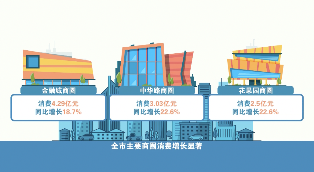 在多项促消费活动的加持下,城市节日消费呈现出“多点引爆、全域升温”的火热氛围。数据显示,全市主要商圈消费增长显著,其中,金融城商圈消费4.29亿元,同比增长18.7%;中华路商圈消费3.03亿元,同比增长22.6%;花果园商圈消费2.5亿元,同比增长22.6%;火车站商圈消费2.34亿元,同比增长23%。