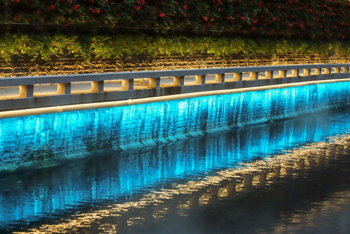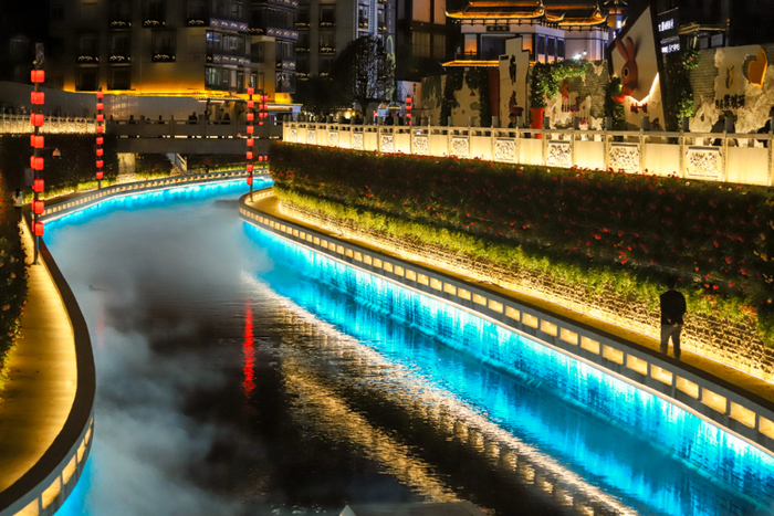 4月23日晚,位于贵阳市南明区老城核心的贯城河博爱路段沿河景观灯依次点亮,清澈的河水与绚丽的灯光交织在一起,为贵阳城市夜景增添了一道亮丽的风景线。据了解,这是贯城河博爱路段“揭盖复涌”后首次亮灯。