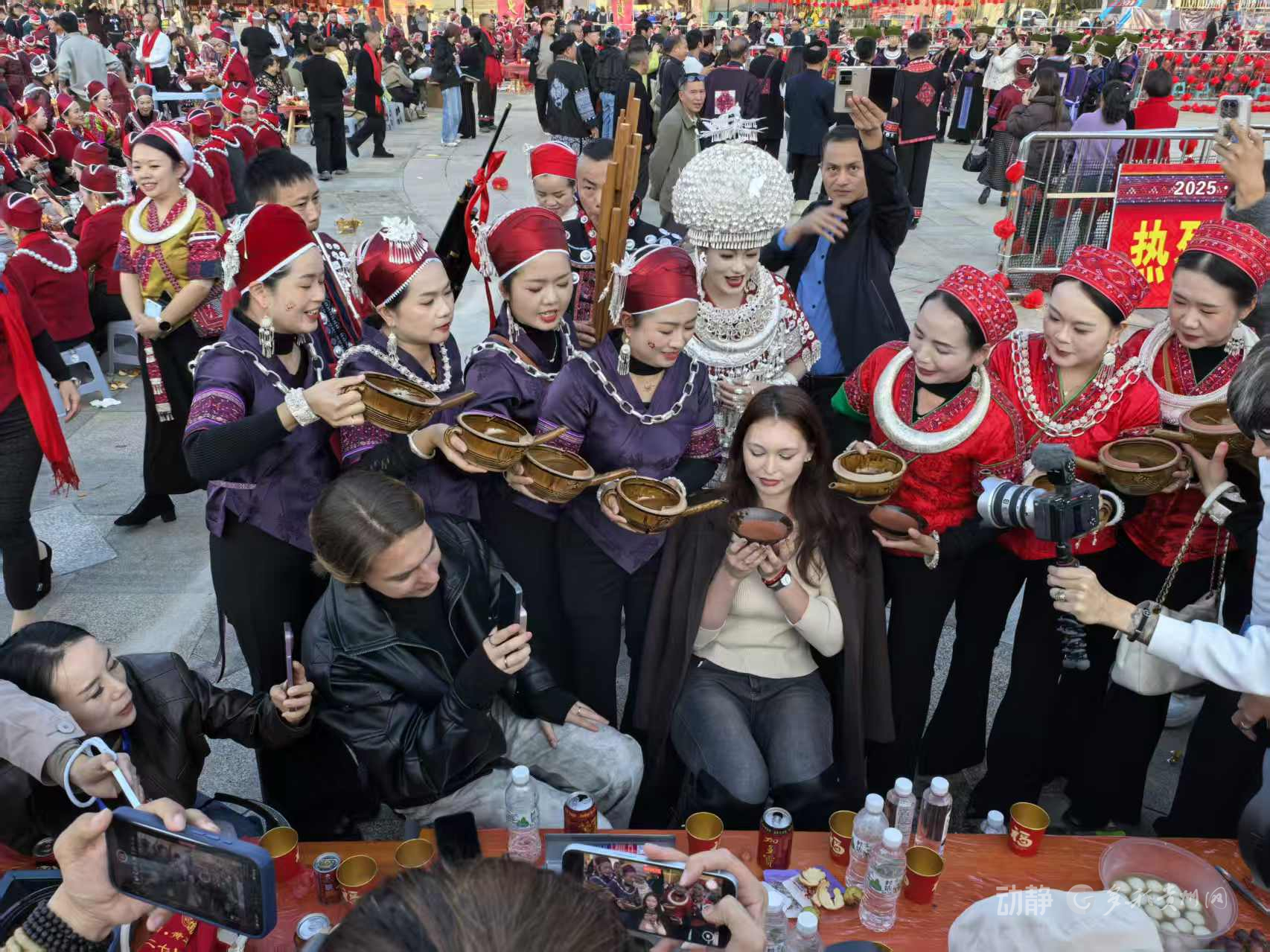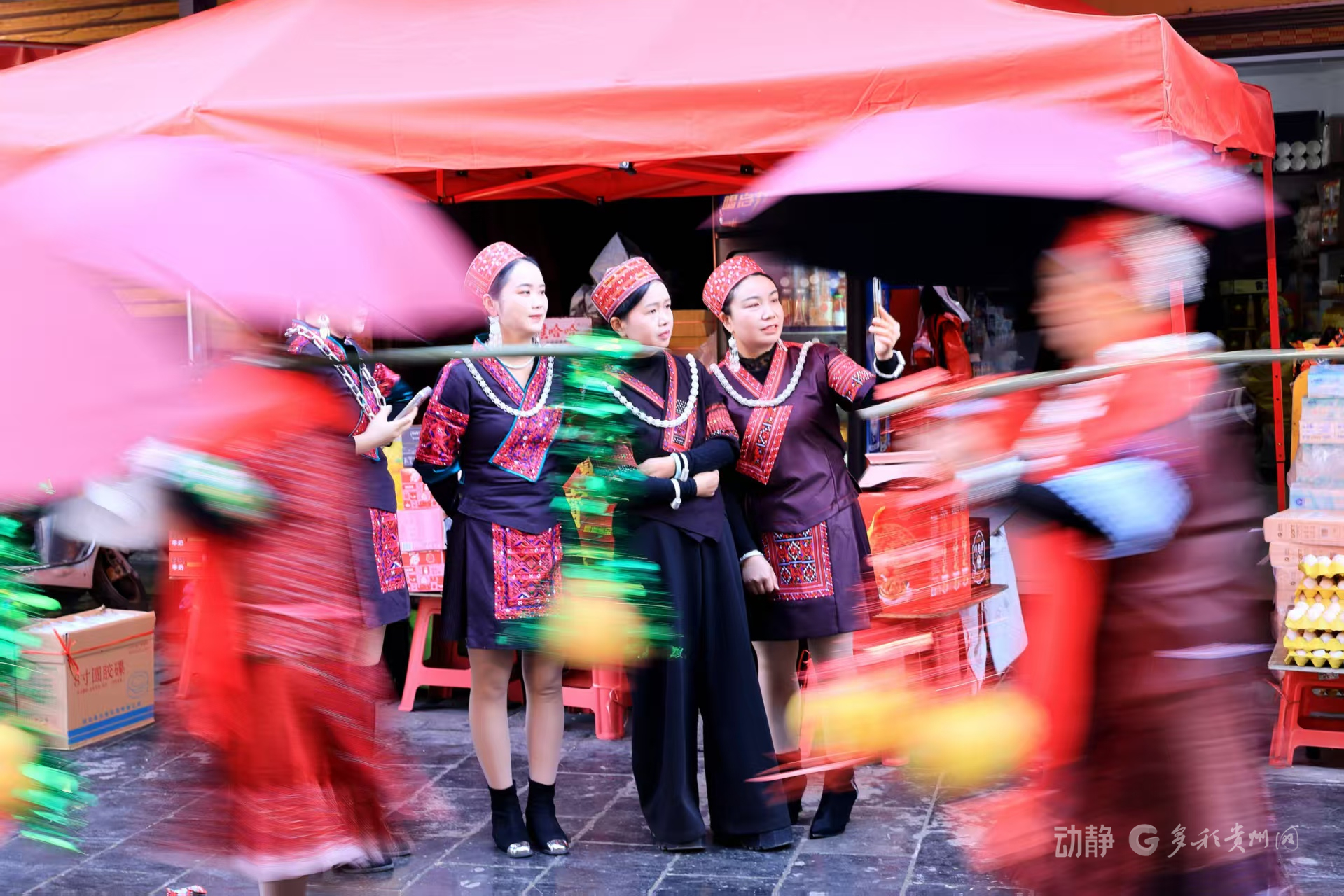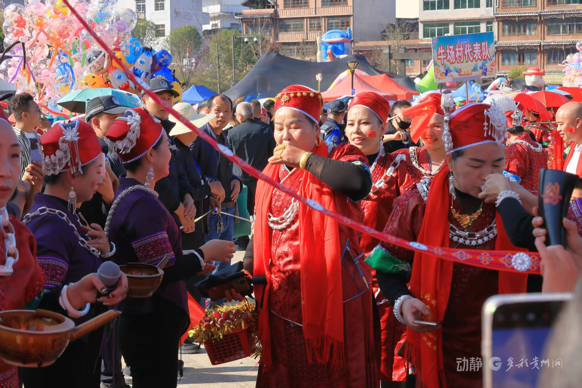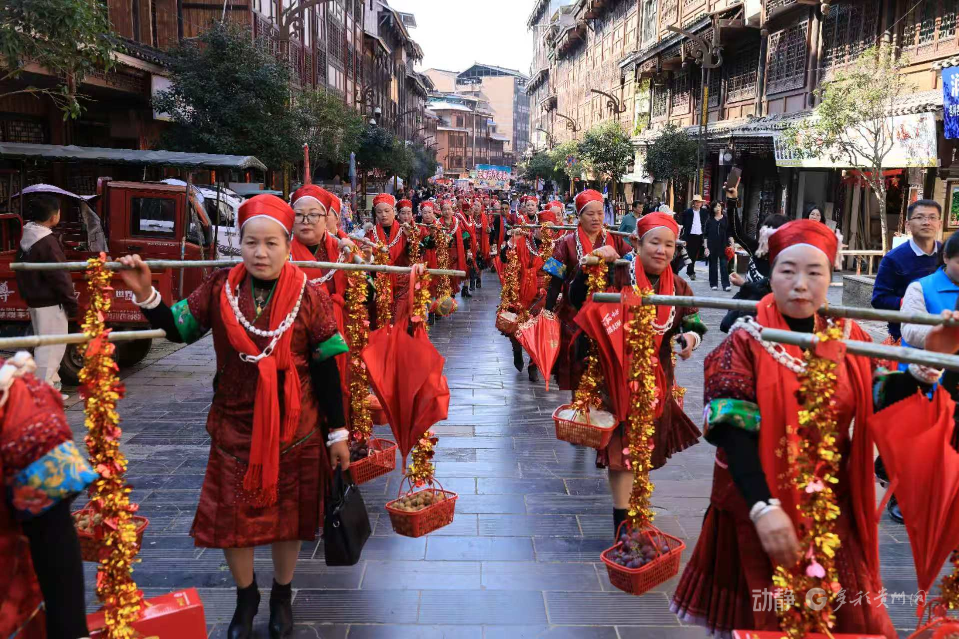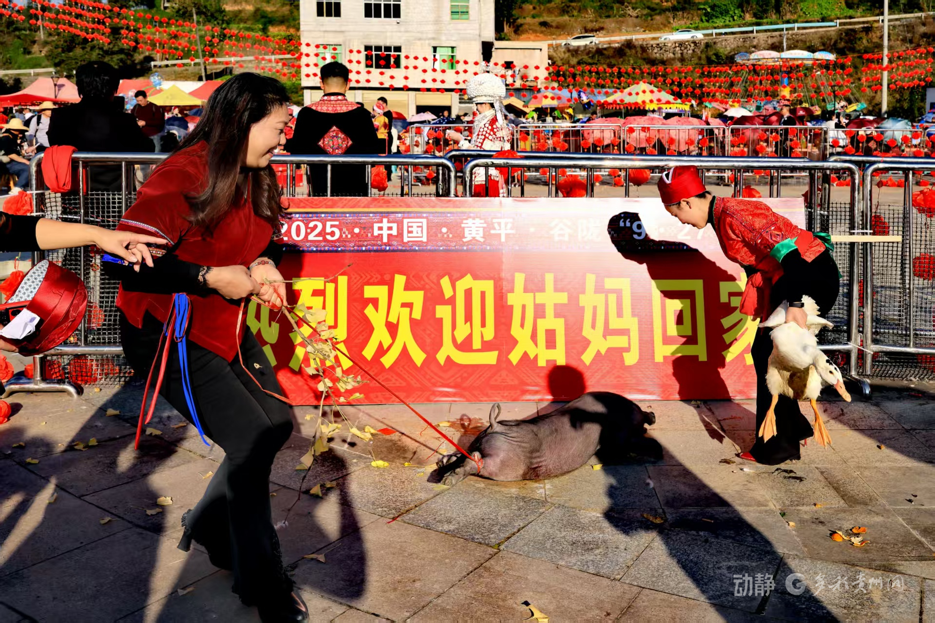 当天,黄平县各地的姑妈姑爹身着节日盛装,肩挑各种回门礼品,兴高采烈地游走在谷陇镇街头,与游客们共同分享回家的喜悦。随后,千人长桌宴也拉开了帷幕,姑妈姑爹邀请游客共同在芦笙广场捉鸭、逮猪,唱苗歌,喝米酒,一同话亲情、品佳肴,分享传统民俗的快乐。