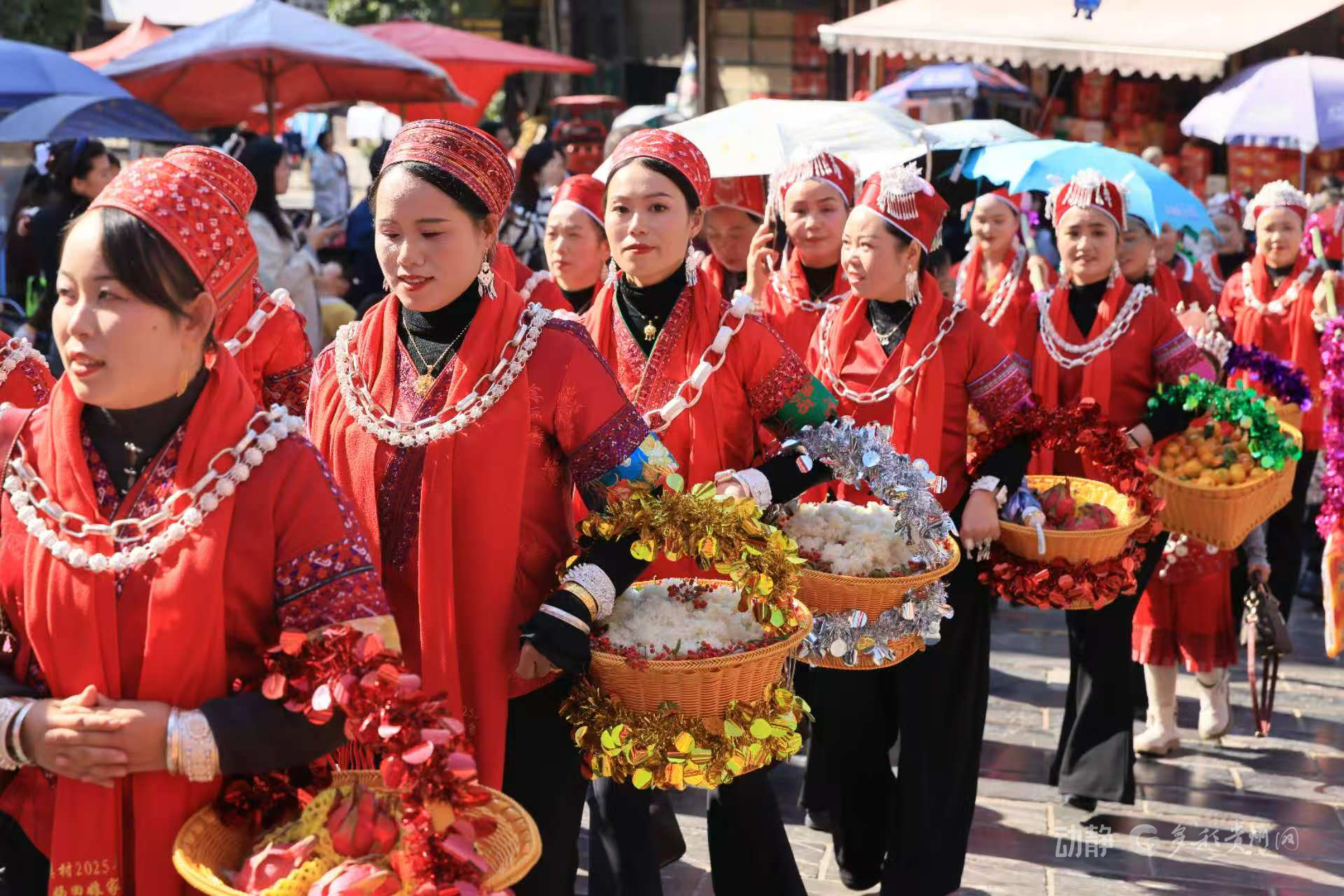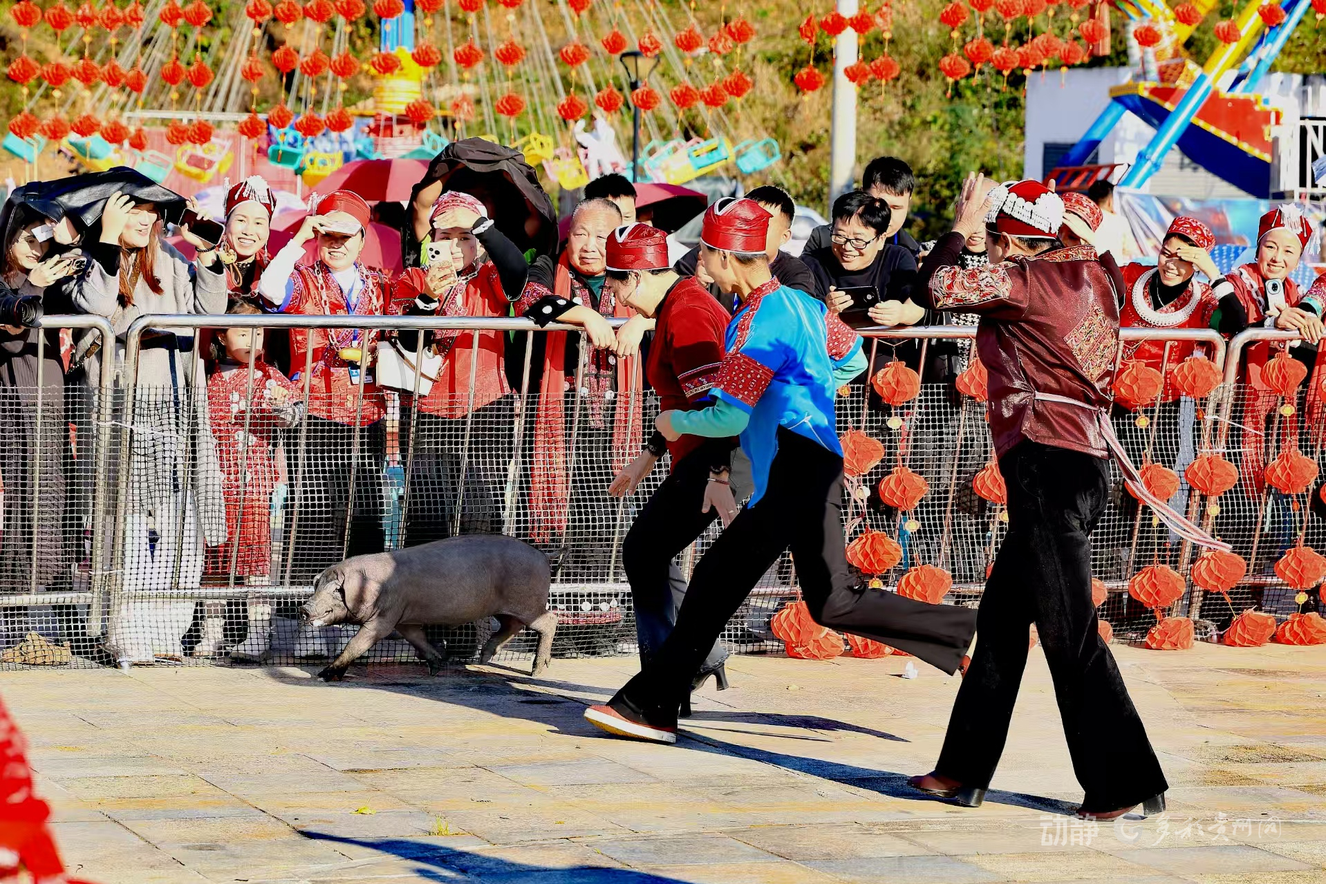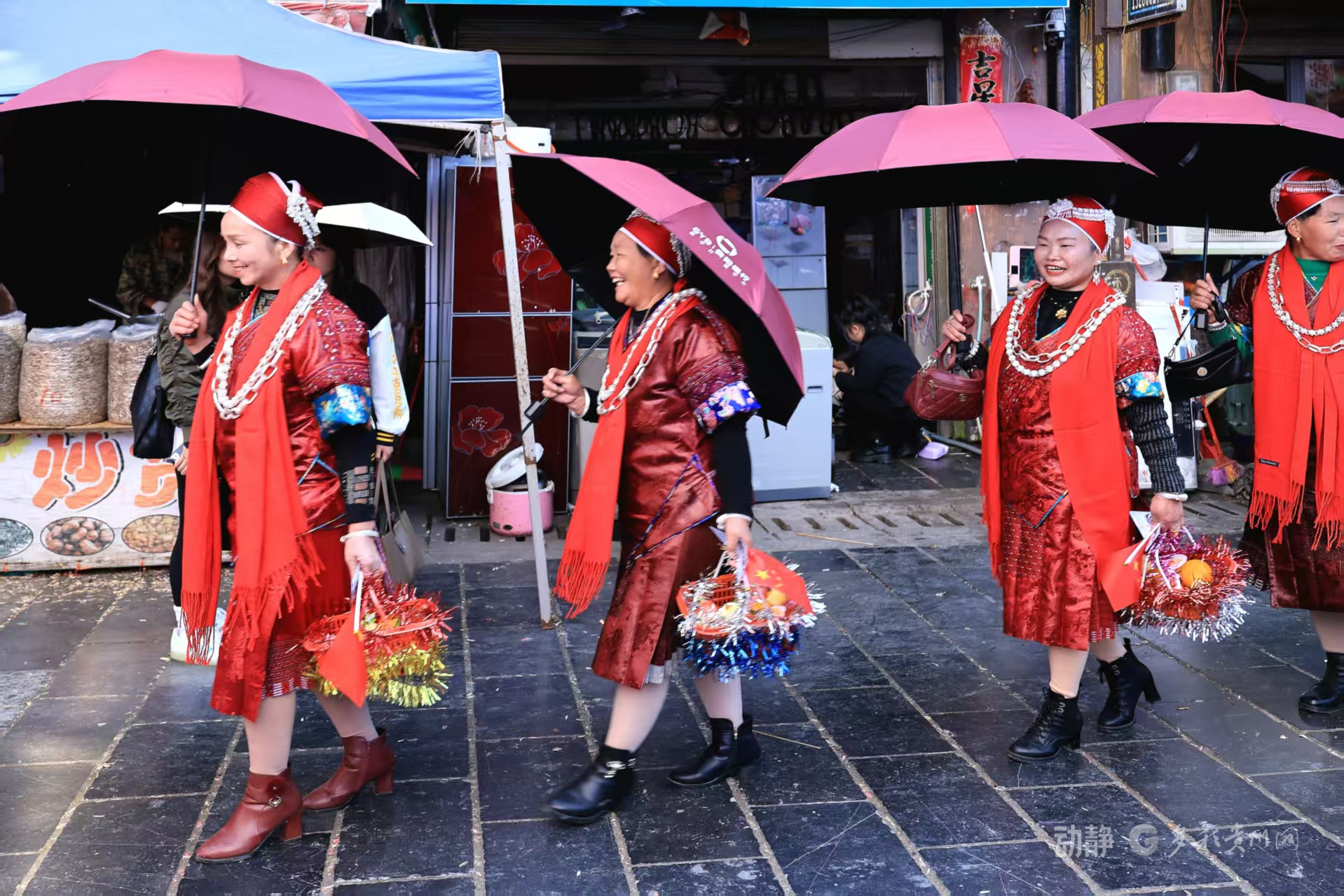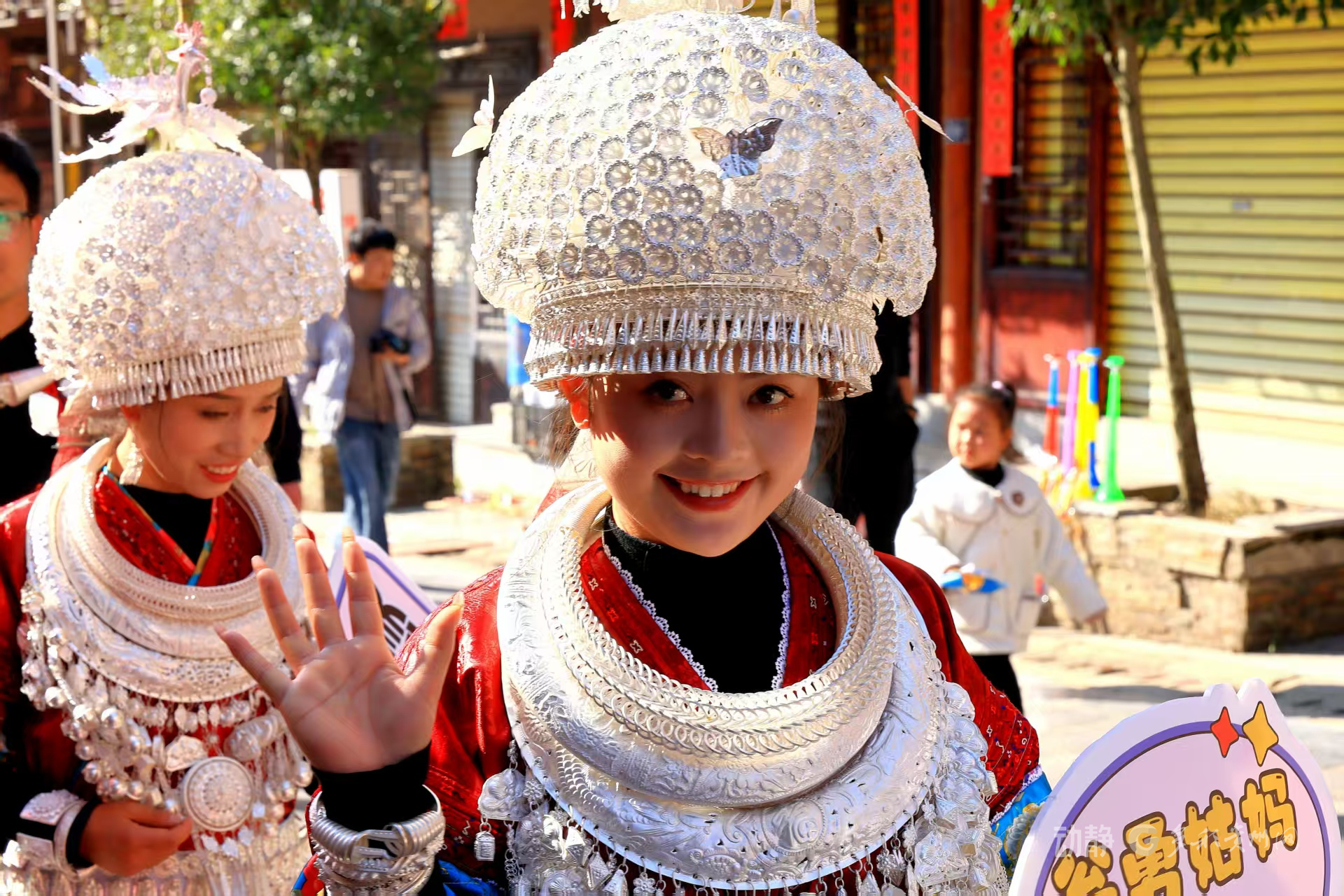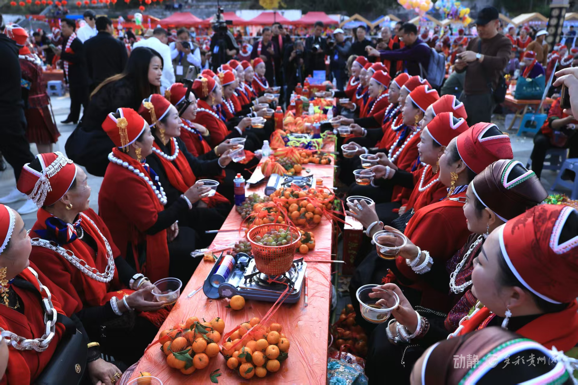 当天,黄平县各地的姑妈姑爹身着节日盛装,肩挑各种回门礼品,兴高采烈地游走在谷陇镇街头,与游客们共同分享回家的喜悦。随后,千人长桌宴也拉开了帷幕,姑妈姑爹邀请游客共同在芦笙广场捉鸭、逮猪,唱苗歌,喝米酒,一同话亲情、品佳肴,分享传统民俗的快乐。