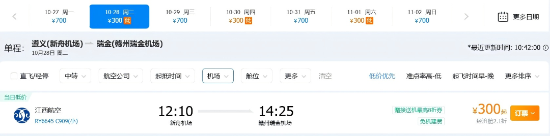 12:10从遵义新舟机场起飞,14:25抵达赣州瑞金机场;