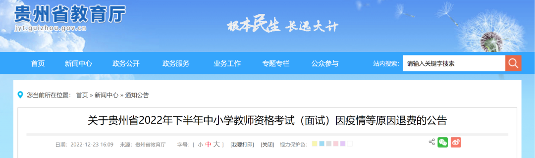 12月23日,省教育厅发布“关于贵州省2022年下半年中小学教师资格考试(面试)因疫情等原因退费的公告”。内容如下: