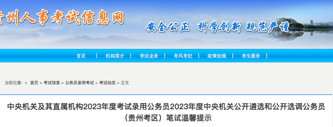 中央机关及其直属机构2023年度考试录用公务员笔试将于2023年1月7日、8日举行,2023年度中央机关公开遴选和公开选调公务员笔试将于2023年1月7日举行,为保障考生顺利参加考试,现对贵州考区考生温馨提示如下:
