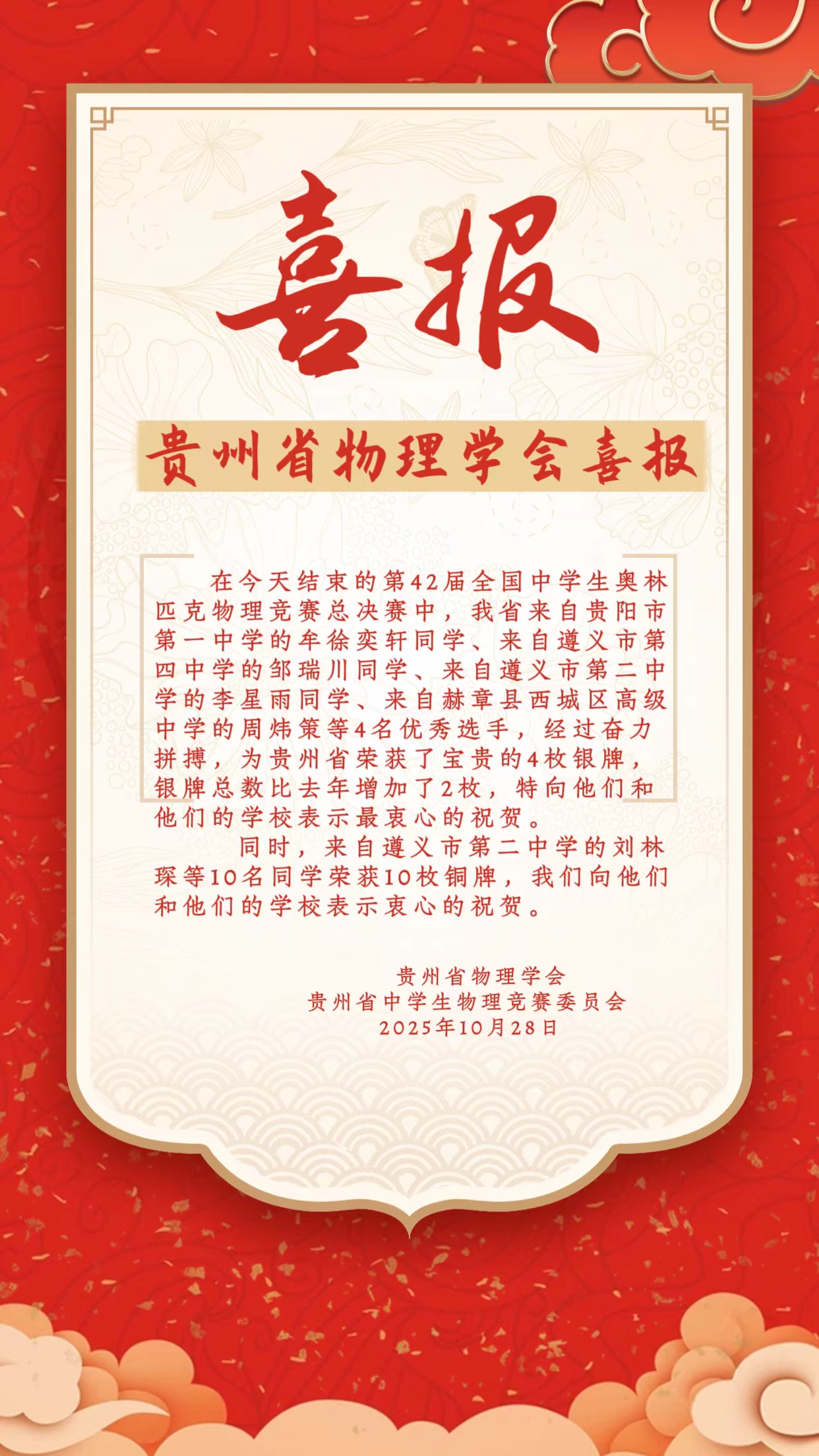 有福之州,英才少年勇攀科学高峰;物理殿堂,贵州学子斩获历史殊荣。在刚刚结束的第42届全国中学生物理竞赛决赛中,贵州代表队以4银10铜的优异成绩创造了历史最好成绩,在全国物理学顶尖竞技场上展现了贵州学子的实力。