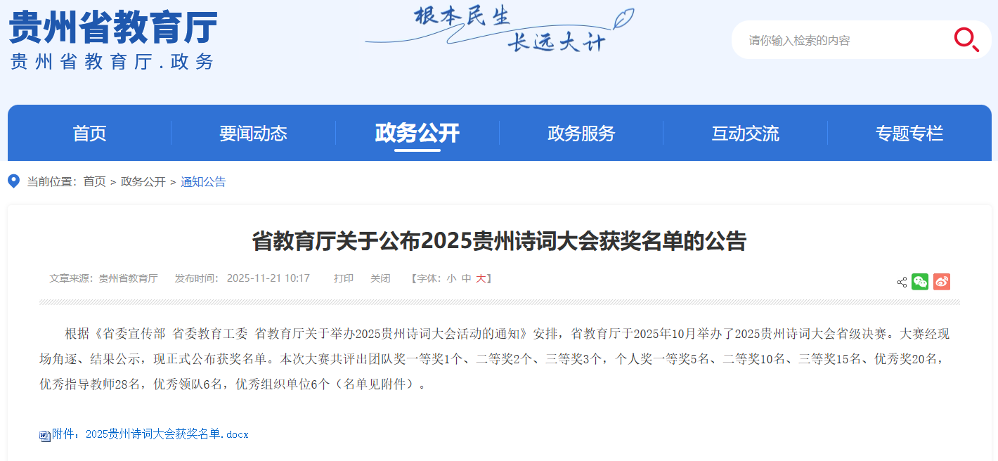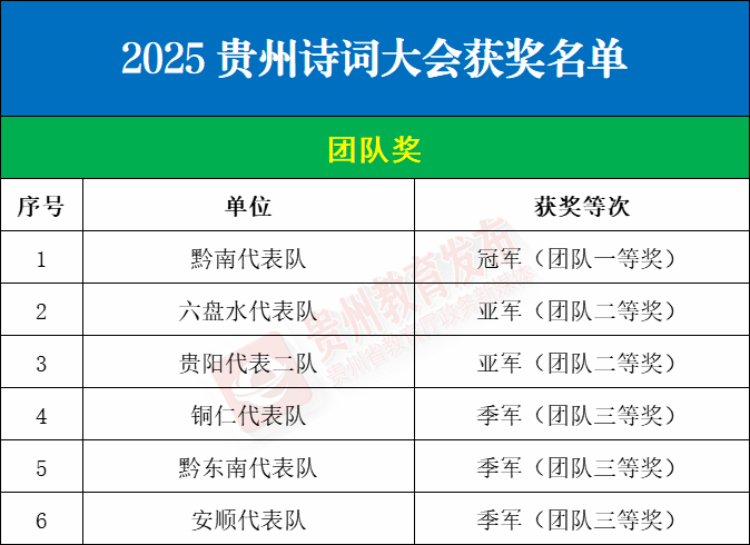 2025年10月,省教育厅举办了2025贵州诗词大会省级决赛。大赛经现场角逐、结果公示,现正式公布获奖名单。本次大赛共评出团队奖一等奖1个、二等奖2个、三等奖3个,个人奖一等奖5名、二等奖10名、三等奖15名、优秀奖20名,优秀指导教师28名,优秀领队6名,优秀组织单位6个。一起来看——