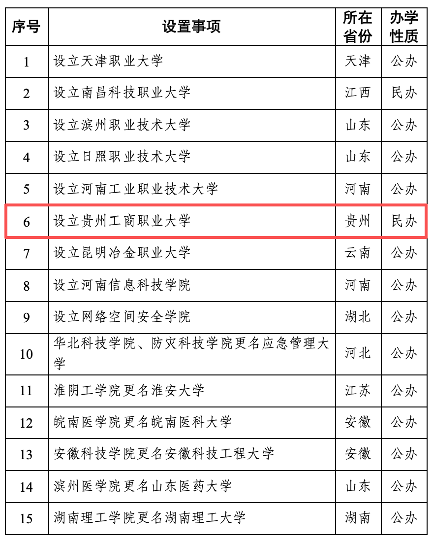 根据《中华人民共和国高等教育法》《普通高等学校设置暂行条例》《普通本科学校设置暂行规定》《本科层次职业学校设置标准(试行)》等有关规定,经教育部党组会议审议,拟同意设置天津职业大学等15所学校,现予公示。拟同意设置本科高等学校名单: