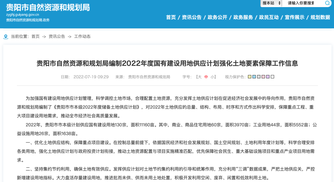 7月19日,贵阳市自然资源和规划局发布了贵阳市自然资源和规划局编制2022年度国有建设用地供应计划强化土地要素保障工作信息。
