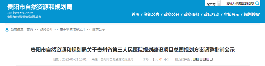 6月21日,贵阳市自然资源和规划局发布关于贵州省第三人民医院规划建设项目总图规划方案调整批前公示。