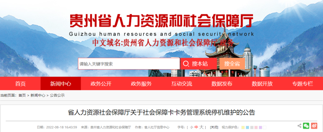 8月18日贵州省人社厅网站消息,因工作需要,全省社会保障卡卡务管理系统将进行停机维护,现就有关停机事宜公告如下: