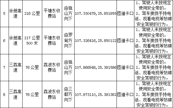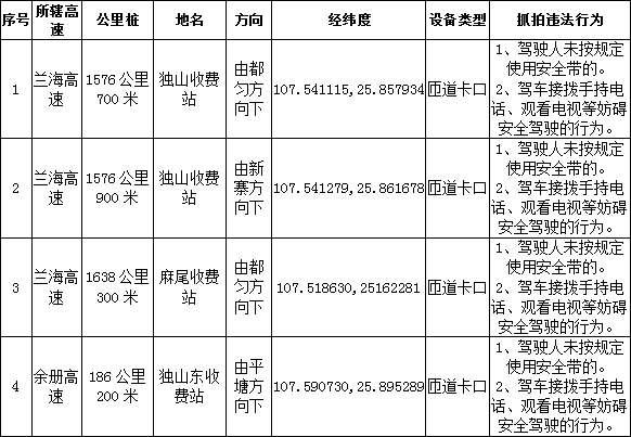 为规范道路交通秩序,有效预防和减少道路交通事故,确保道路交通安全,针对黔南境内高速公路通行实际状况和交通事故发生的规律、特点,根据《中华人民共和国道路交通安全法》、《贵州省道路交通安全条例》的有关规定,现对兰海、余册、三荔高速启用技术抓拍设备,主要用于抓拍: