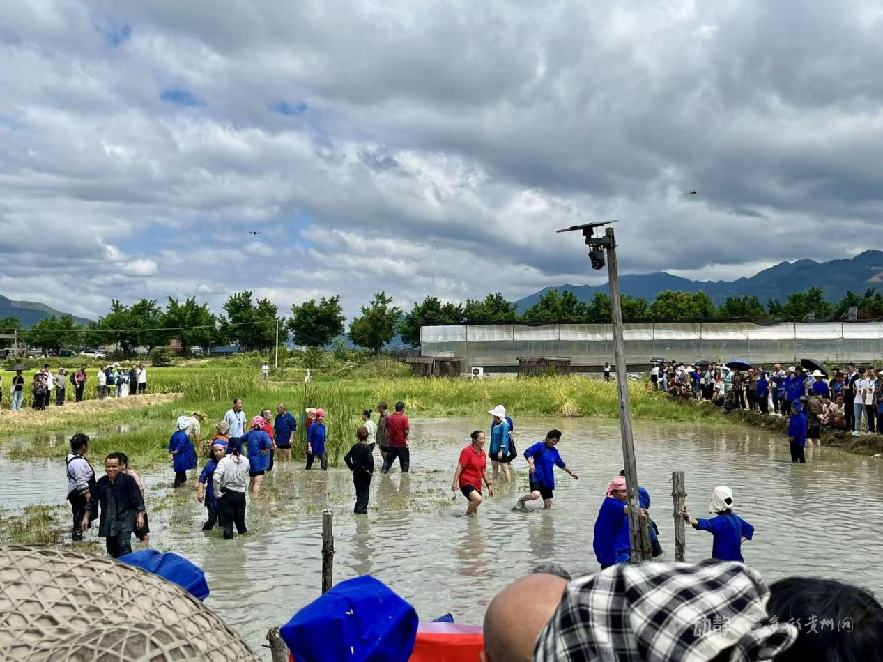 在分会场榕江县三宝侗寨,手打谷子、水田捕鸭等趣味农事活动轮番登场,吸引了大批村民参与。