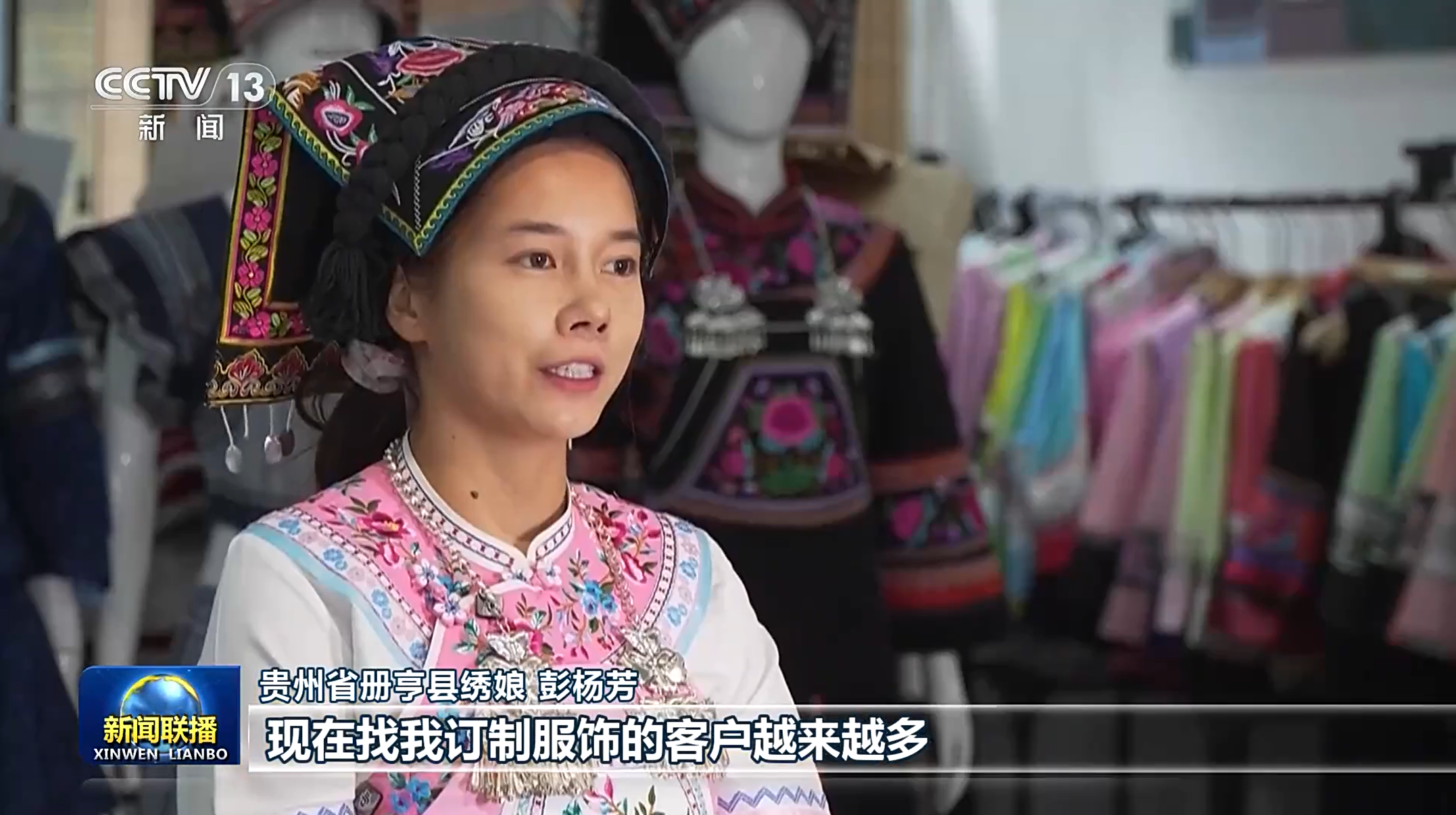 贵州省册亨县绣娘彭杨芳说:“现在找我定制服饰的客户越来越多,日子也是越来越好了,过上‘背着娃、绣着花,养活自己、养活家’的好生活。”