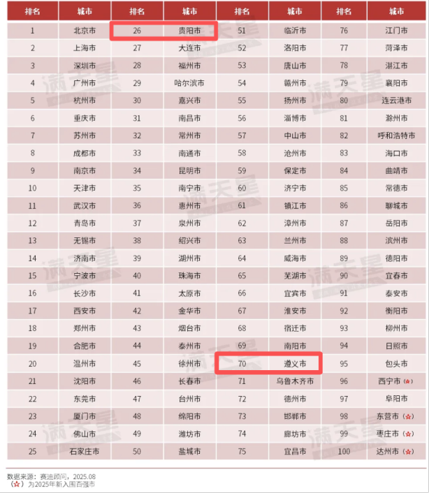 在数字百强市榜上,贵州省贵阳位列26名,遵义位列70名。