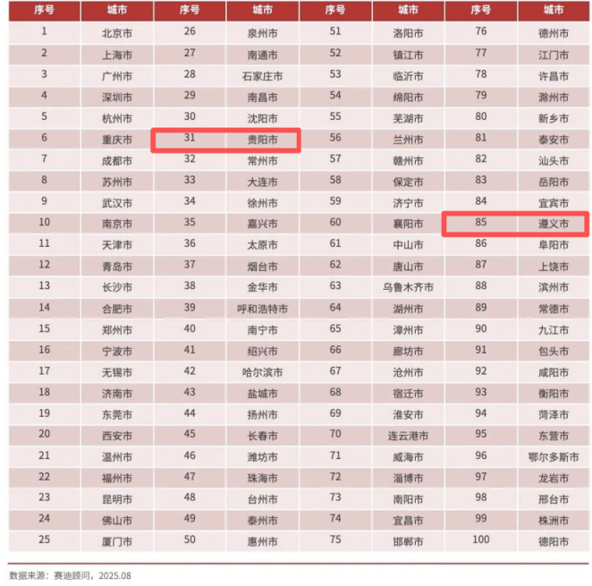 近日,中国电子信息产业发展研究院赛迪顾问发布2025“数字百强市”和“数字经济百强市”名单。贵州省贵阳市、遵义市双双入列。