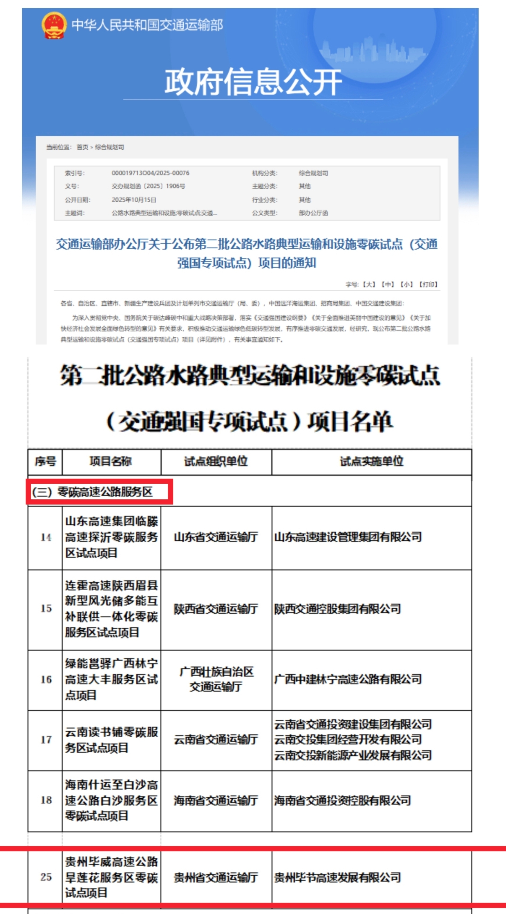 10月15日,交通运输部公布第二批公路水路典型运输和设施零碳试点(交通强国专项试点)项目名单,全国共26个项目入选,其中,贵州高速集团所属毕节高发公司旱莲花服务区上榜,成为全国12个之一、贵州首个入选的高速公路零碳试点服务区。