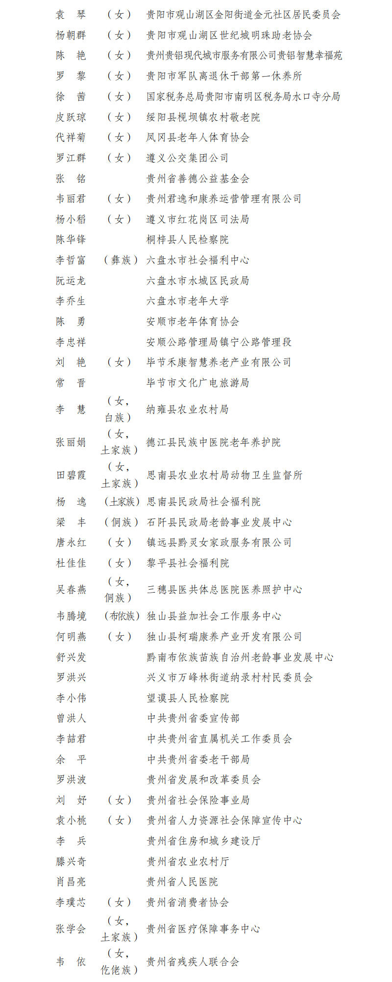 贵州省获全国“敬老爱老助老模范人物”称号名单(44人)