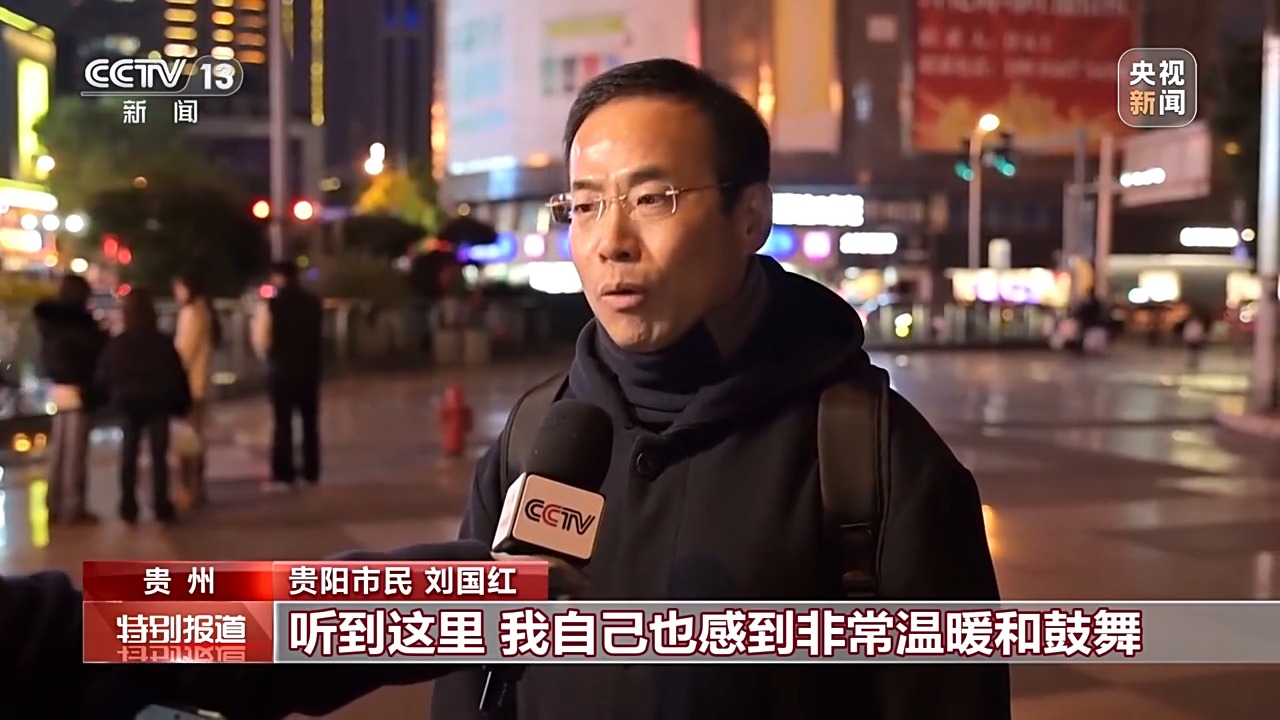贵阳市民刘国红说:“文旅市场人气火爆,‘城超’‘村超’热闹非凡,听到这里,我自己也感到非常温暖和鼓舞。2025年贵州的旅游也非常火爆,我也刚刚从路边音乐会过来,感觉非常热闹,很有幸福感、获得感。”