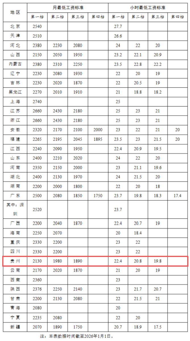 其中,贵州第一档月最低工资标准为2130元,第一档小时最低工资标准为22.4元。