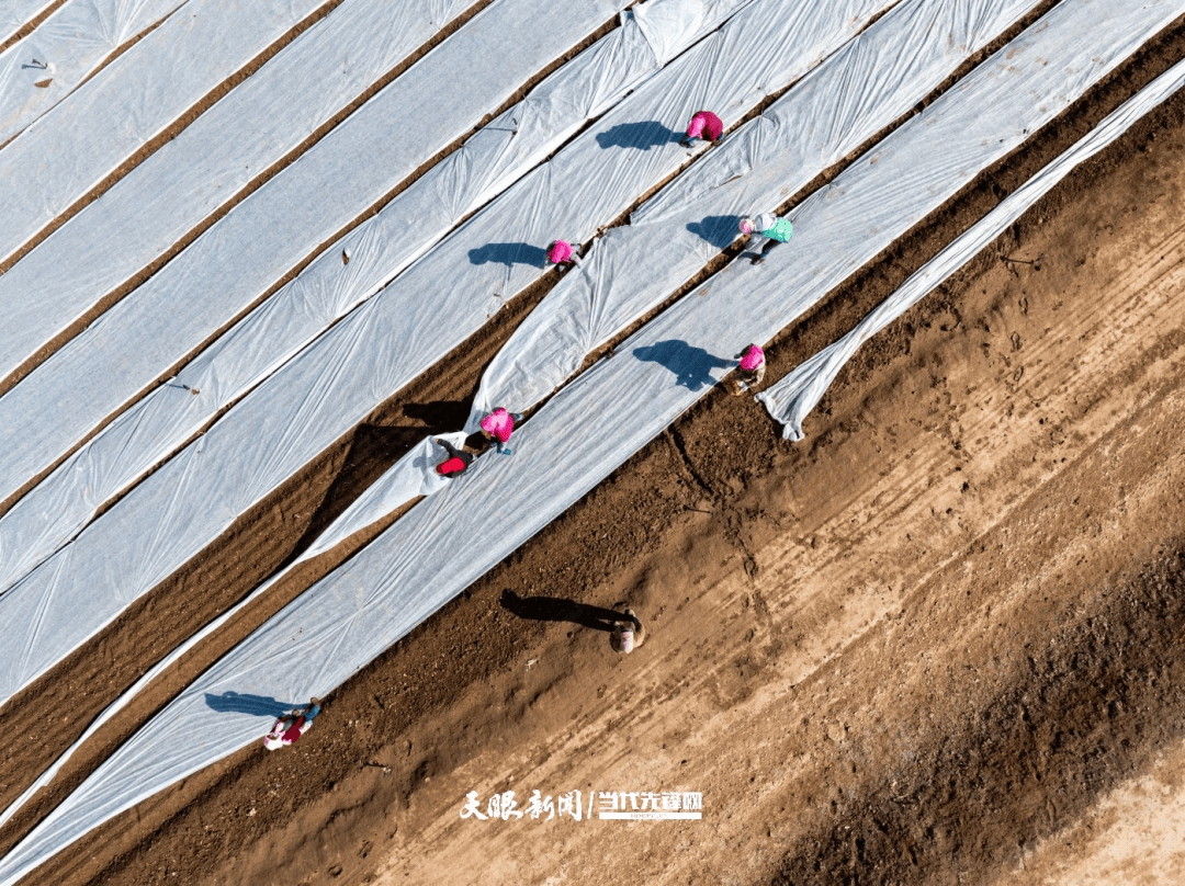宁夏永宁县李俊镇双晖菜场内,来自贵州的务工人员正在菜地里进行“覆膜”工作