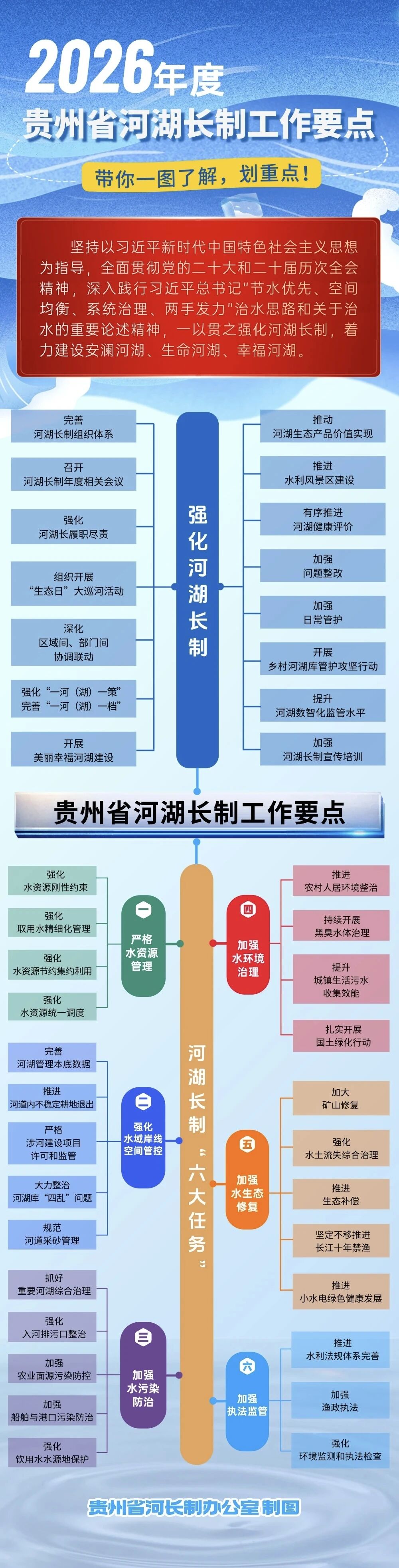 《2026年度贵州省河湖长制工作要点》聚焦严格水资源管理、加强水环境治理、强化水域岸线空间管控、加强水污染防治、加强水生态修复、加强执法监管六大核心任务,推动河湖治理向系统化、精细化、智能化升级。