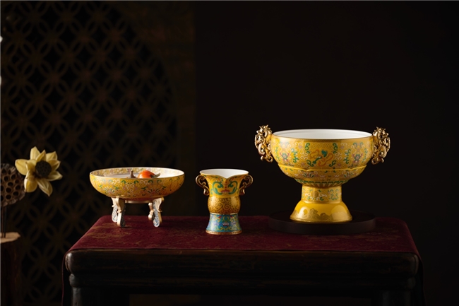 大尊瓶巧妙结合了收藏价值与实用功能。既可轻松拆解为包含坚果盘、水果盘、糖果盘、分酒器及酒杯的完整宴饮套装;又能严丝合缝,组合成气势恢宏的“福寿万疆大尊瓶”,成为雅室中的艺术摆件。整体设计上不仅融入“五行”哲学与“福禄寿喜财运”六顺寓意,更是在坚果盘两侧饰以“龙马”耳饰,灵感源自西汉鎏金铜当卢,为团圆宴饮增添一份历史厚度。