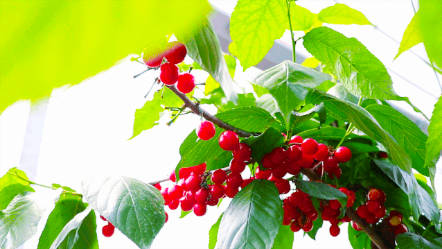 这里的樱桃主要是玛瑙红,果实椭圆形,果肉厚,口感好,果面鲜红亮丽,品质上佳。