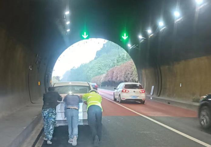 经下车询问驾驶人余某得知,事发前,余某驾驶车辆行驶至红花岗隧道中段时,车辆突然自动熄火无法行驶,不得已停在隧道快速车道上。为了不影响交通,民警在后方用警车警示,并与余某及同行的朋友一起,将车辆推至隧道外左侧加宽带等待救援。